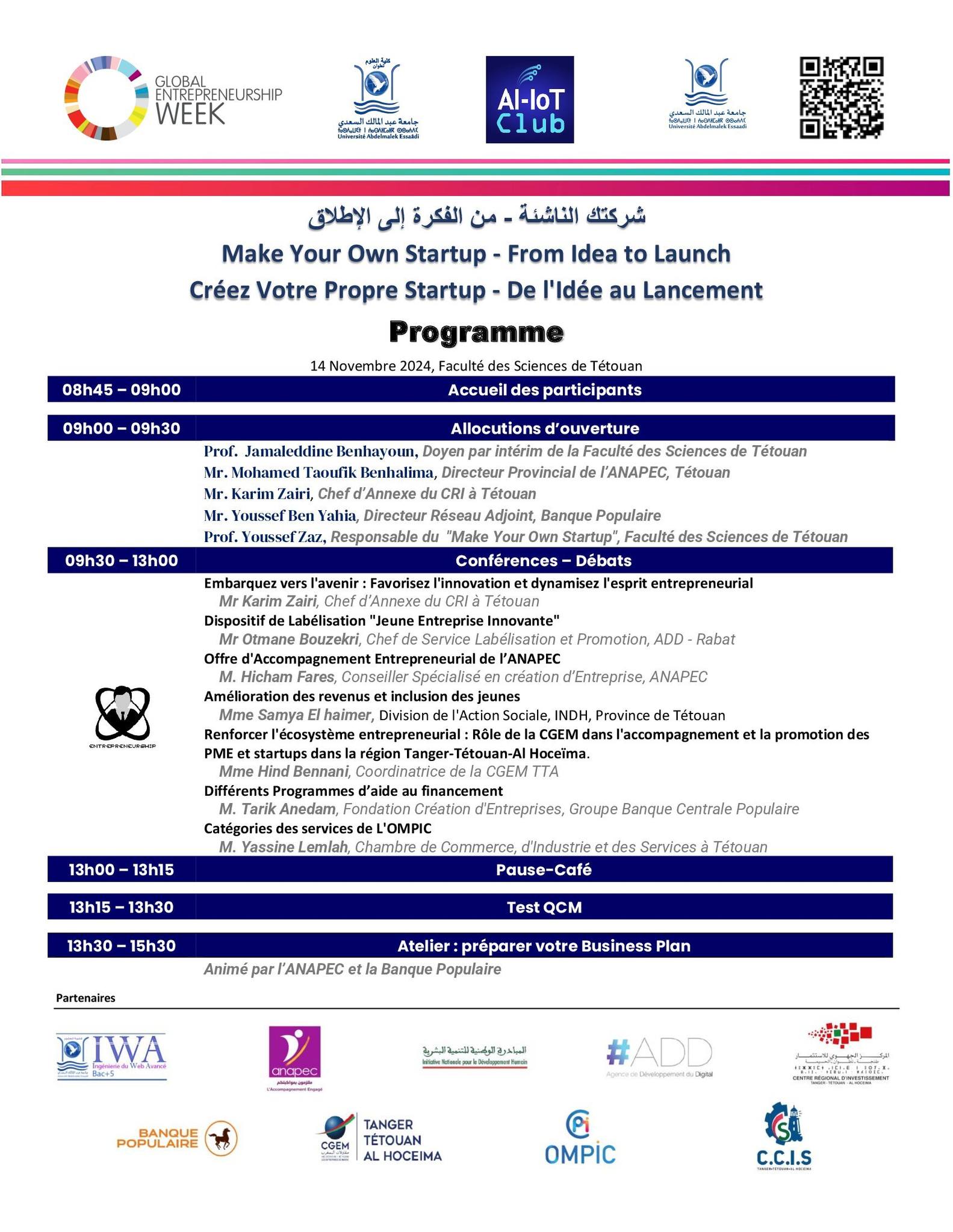 Vous êtes passionnés par l’entrepreneuriat et vous rêvez de lancer votre propre startup ? Ne manquez pas notre conférence « Make Your Own Startup : From Idea to Launch », suivie d'un atelier pratique pour vous aider à construire un business plan solide.