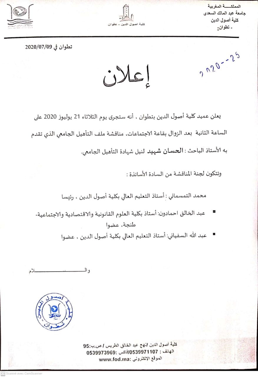 يعلن عميد كلية أصول الدين بتطوان، أنه ستجرى يوم الثلاثاء 21 يوليوز 2020 على الساعة الثانية بعد الزوال بقاعة الاجتماعات، مناقشة ملف التأهيل الجامعي الذي تقدم به الأستاذ الباحث : الحسان شهيد